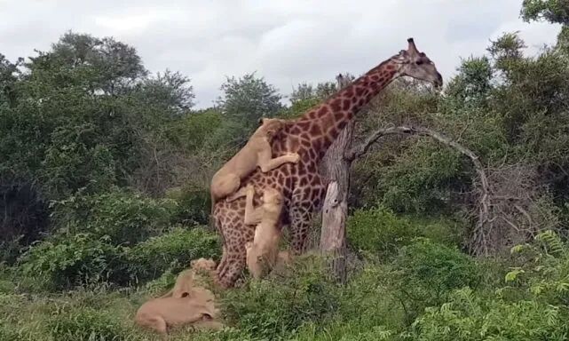 在南非克拉西里禁猎区,拍下了一群狮子猎杀长颈鹿的罕见视频。