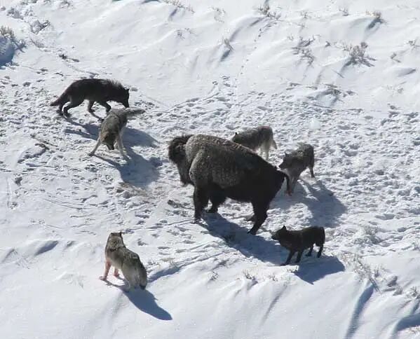 另一个是,狼群进食的时候是没有优先顺序的。当狼群捕捉到猎物后,是一拥而上一起享受美食的,等进食到一定程度之后,“繁殖者”(现在狼群的领袖经常被叫作繁殖者--“breeder”)会驱散其它狼群成员,而留下一些食物用于抚养刚出生的狼崽。