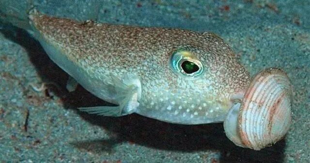 在这个过程中,河豚还会将杂草一类的东西清理干净,只留下沙子,有时还会衔来贝壳装饰一下。