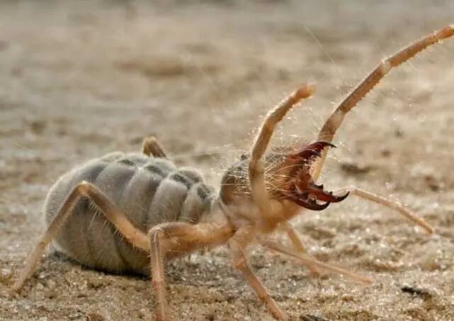 还有一点值得注意,骆驼蜘蛛虽然无毒,但它有大螯肢,若被它蛰了,还是会很难受的。