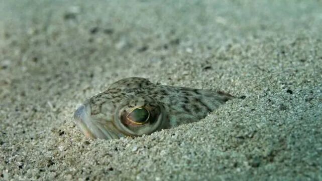 第二种是固定通气孔方式,运用这种呼吸方式的鱼一般都是伏击高手,它们把自己身体(包括嘴巴)埋在沙子底下,然后通过一个固定气孔——比如眼睛来吸水呼吸。