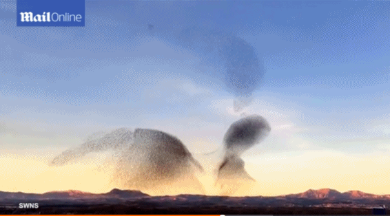 成千上万只椋鸟组成一个集体,它们在天空中相互配合,行云如流水,时而像是受到打扰而短暂分开,时而又像是收到特殊信号突然聚集在一起。