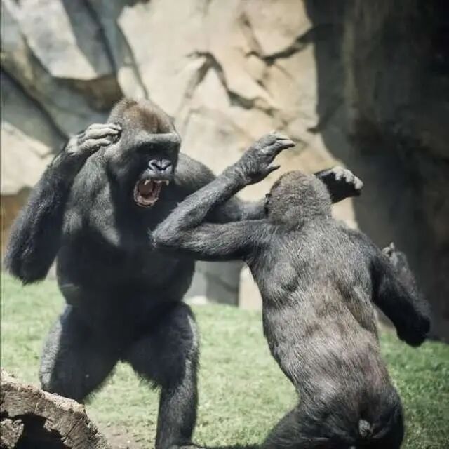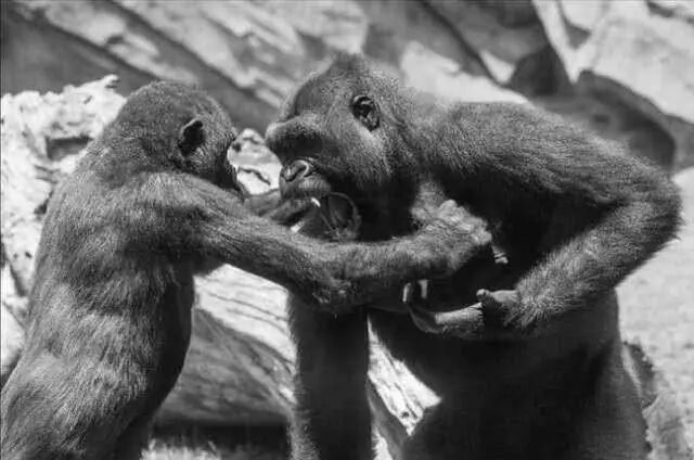如果这只黑猩猩不让开不屈服,占统治地位的黑猩猩就会快速冲过去狠狠地扇他一巴掌,然后双方就会爆发激烈的争斗。