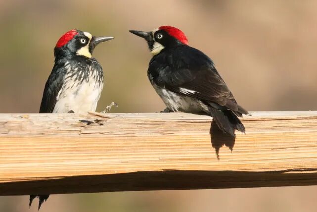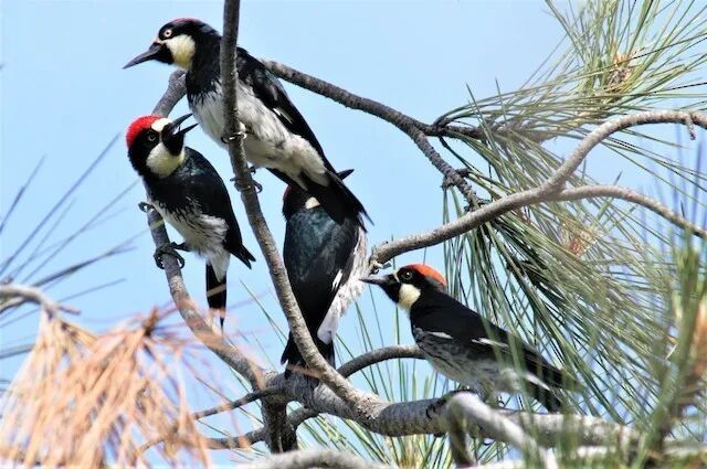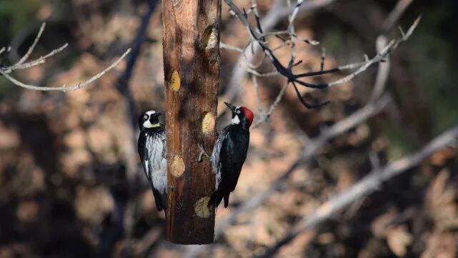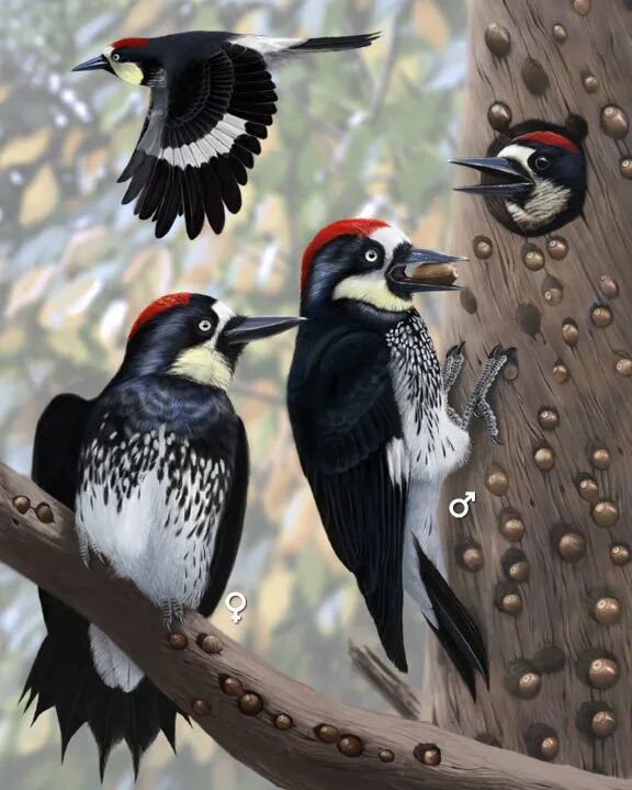 橡树啄木鸟可以占据长达15英亩(约15个足球场)的领地,这些啄木鸟的家庭成员保卫它们的领地安全。