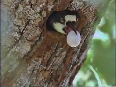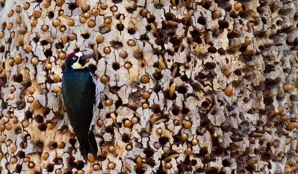 橡子只在秋天出现,为了保证全年的食物供应,橡树啄木鸟有囤橡子的习惯,而它们的粮仓也很特别。