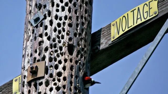 通常粮仓都比较大,它们会选择树木、电线杆、围栏,以及任何木质的结构为目标,再进行简单加工,在这些主体上啄出成千上万个单独的小孔,然后在这些小孔里面塞满橡子,密密麻麻的。