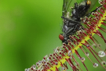 茅膏菜的武器是一群覆盖着鬃毛的茎状触须,它们的头部被看上去像水滴的东西包围着,但实际上是由一种粘稠的液体组成,猎物一沾上就无法逃脱,这些触须会卷曲起来,将昆虫整个吞下。