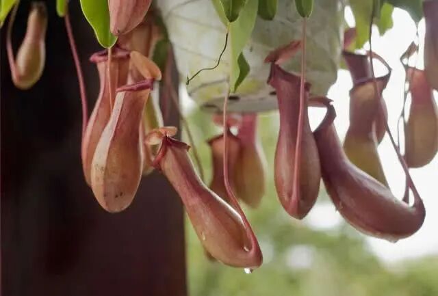 猪笼草外形像猪笼而得名,瓶状体,上面还有盖子,和捕蝇草的策略相似,用蜜汁诱惑,当虫子爬到瓶口后,瓶口光滑容易掉入瓶底,一旦掉下去就再也出不来了,猪笼草分泌的汁液会将虫子淹死。