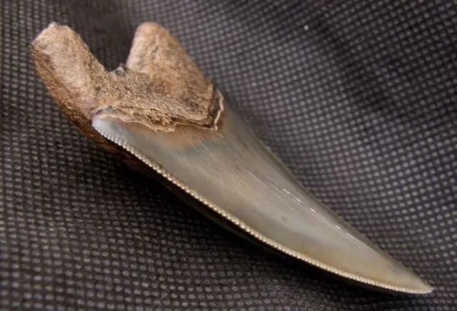 目前已知的最大的鲨鱼牙齿标本,来自佛罗里达州的戈登•哈贝尔,高18.4cm,需要两只手才能覆盖住,是现有的大白鲨牙齿的好几倍。
