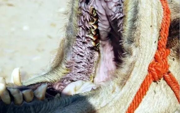骆驼的口腔比一般的要坚硬,而且凹凸不平,布满了凸起的圆锥形乳突,这种乳突由角蛋白构成,非常坚硬。