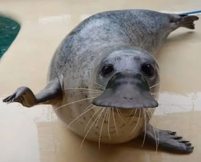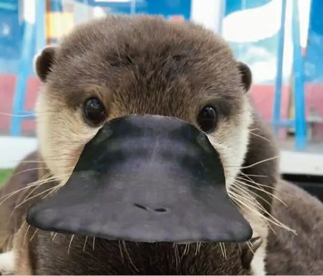 身体像毛茸茸的水獭,尾巴形状和海狸一样,四肢短且有蹼,和鸭掌很相似,最为奇怪的是,嘴巴上好像被安装了一个假的鸭嘴,十分怪异。