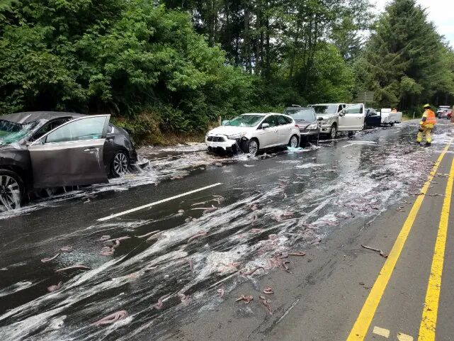 2017年7月14日,一辆装有成千上万条“鱼”的卡车在高速公路上发生了交通事故,追尾了一辆汽车,而这些黏液就是在追尾过程中,卡车里的“鱼”分泌的。黏液导致多辆汽车无法行驶,造成交通堵塞,最后交通部门开来了推土机和高压水车清理,才让交通恢复正常。