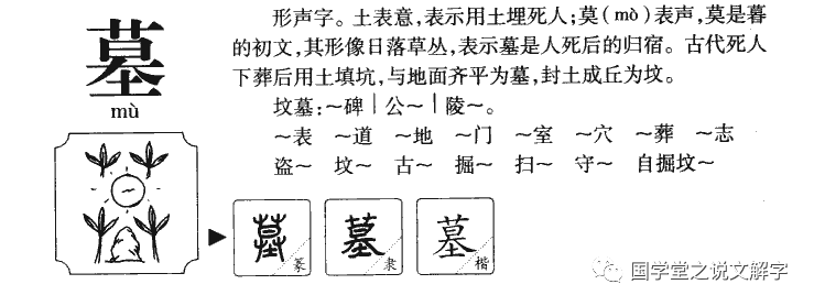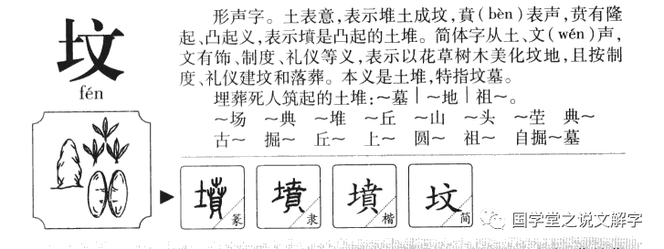 而“坟”,则是后来随着坟丘墓的出现,把上面高出地面的那堆封土称“坟”,封土的流行,慢慢的让坟与墓变成了“坟墓”,通常又立碑作为标识。