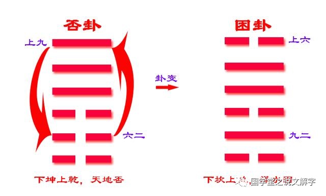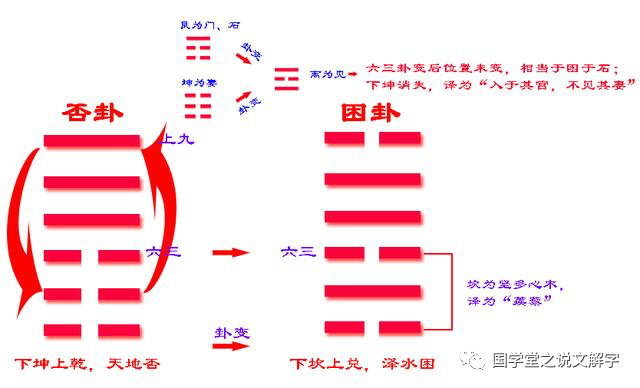 原来在否卦是互卦艮,艮为门阙;进入困卦之后成为互卦离,离为见;并且原在否卦的下卦坤消失,坤为母、为妻,所以说“入于其宫不见其妻”。对六三来说,它本身没有改变,但因为九二与上六换了位置之后,代表妻子的坤卦不见了,这当然是不详。