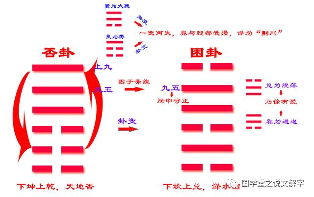 “劓刖”是古代的刑名。九五原在否卦,否卦有互卦艮及互卦巽,艮是鼻子,巽是大腿。变成困卦之后,互卦巽、互卦艮都不见了,鼻与大腿都受损,等于是受了两种惩罚。
