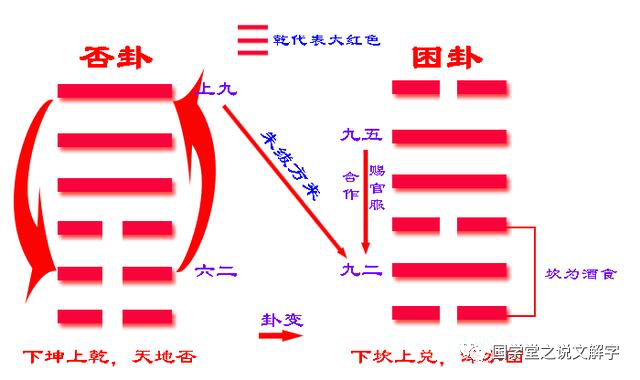 否卦变为困卦,九五没有动,所以困于乾卦的红色官服,乾是红色、是君、是官服。九五在互卦巽,为进退、为不果,也是要慢慢来。困卦上面是兑卦,兑为缺口,意为脱落。不过眼前的困,是可以摆脱的,因为居中守正。