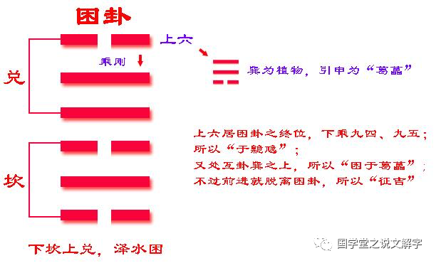 “葛藟”是藤蔓之类,“臲卼”主要是描写在高处的危险状态。上六下临互卦巽,巽为木,在木的上面并且不能动弹,所以“困于葛藟”。处在困卦最终的位置,下乘九四、九五,这是“于臲卼”,在太高、太危险的地方。“动悔”是指由否卦变为困卦的动,因此懊恼而有所悔悟,这时候再往前进自然吉祥,因为可以脱离困卦。所以上六在困卦里面,终于可以转危为安,总算是过了这一关。(转自溪上雅士360图书馆)