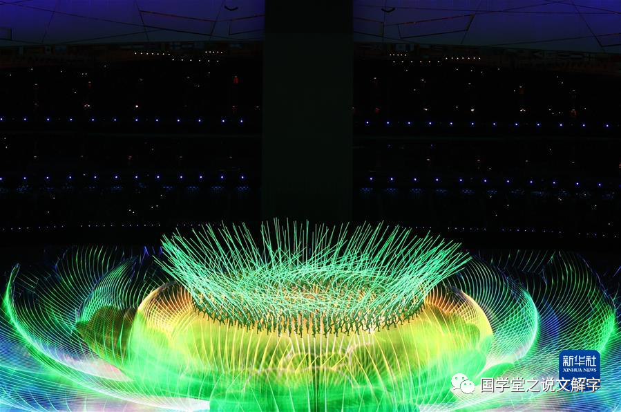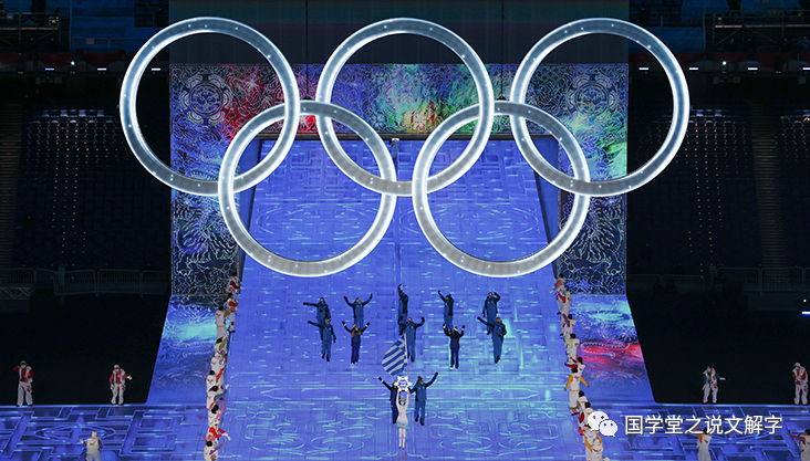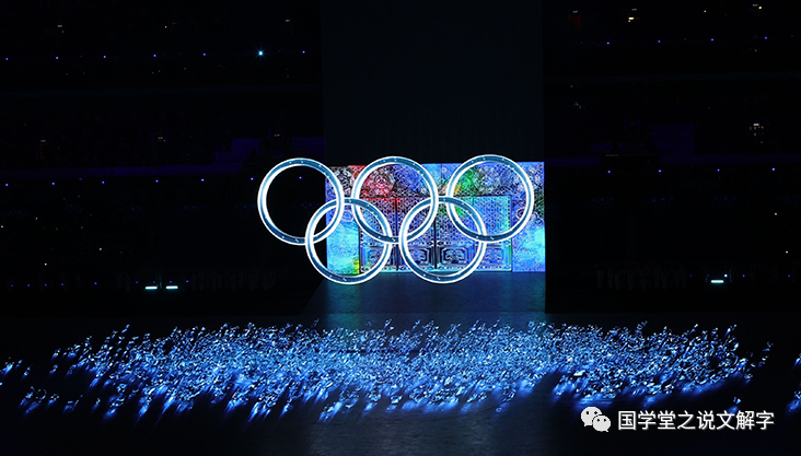 【《冰雪五环》】1、一滴水变成冰。一滴冰蓝色的水墨从天而降,幻化为黄河之水,倾泻而下。整个画面的意境,来自中国古老的诗句“黄河之水天上来”,这是对中国母亲河的浪漫想象和赞美。翻腾的浪涛最终凝结为一片晶莹剔透的冰雪天地,也好像是凝固了时光。