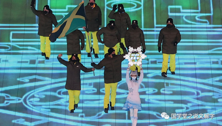 雪花引导牌。根据《开幕式媒体指南》,按照“一朵雪花”贯穿始终的设计理念,引导员手持的引导牌,采用了发光的雪花造型。设计灵感来自“中国结”的图案。中国结是中国古老的手工编织工艺,一个结从头到尾用一根线编成,寓意团结吉祥。