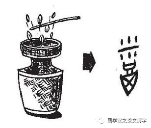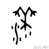 本义:小米(黄米)。《说文解字》:“黍,禾属而黏者也。按,今北方谓之黄米。”黍的穗是散开的,甲骨文的字形突出了这一特征。另外,茎旁有水,表示可以酿酒。
