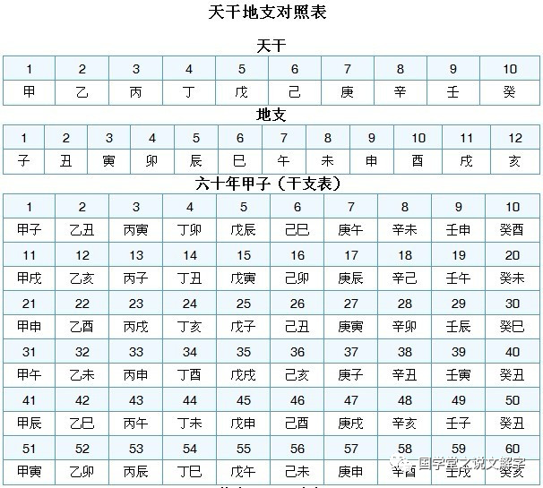 天干地支(英文是 Chinese Era [combination of the Heavenly Stems and Earthly Branches]),简称“干支”,天干:甲、乙、丙、丁、戊、己、庚、辛、壬、癸;地支:子、丑、寅、卯、辰、巳、午、未、申、酉、戌、亥。十干和十二支依次相配,组成六十个基本单位,古人以此作为年、月、日、时的序号,叫“干支纪法”。