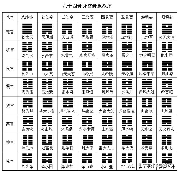 对初学者来说,分宫卦象次序最便于记忆。所谓“爻变”,即前一卦之某爻,或由阳爻变为阴爻,或由阴爻变为阳爻后,转变为另一卦。初学者应一宫、一宫念熟,同时要善于观察卦象的变化规律,念或背的同时,一定要结合记忆每卦之卦象。