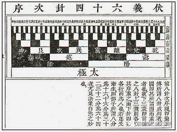方圆图之次序依此图而排列:方图从左至右、从下至上,将下图之一行列为方阵;圆图则是按八卦方位之序(乾1,兑2,离3,震4,巽5,坎6,艮7,坤8)排出六十四卦。