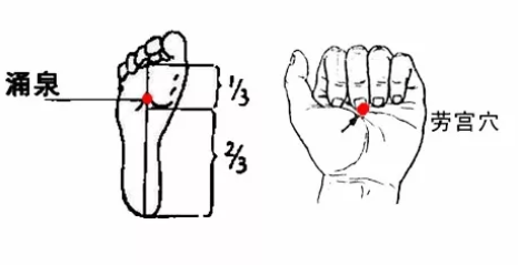 在沐足过程中,可用双手按摩、揉搓脚背及脚心,以左手劳宫穴摩擦右脚底涌泉穴,右手劳宫穴摩擦左脚底涌泉穴,直到产生温热感为止。