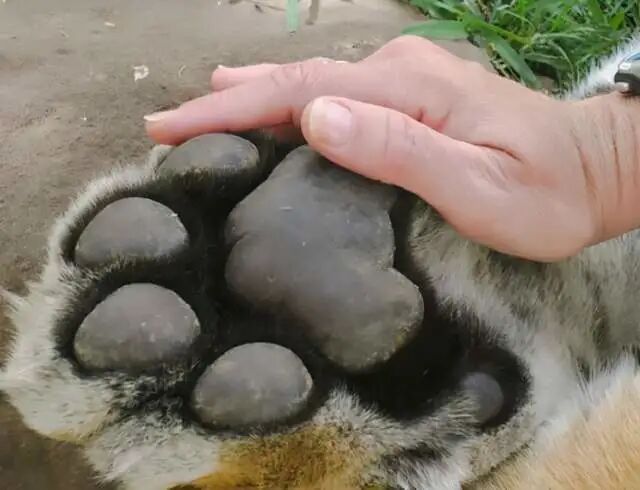 排除掉这些动物之后,就只剩下大型猫科和犬科了,它们才最有可能留下一个这种肉垫踩出的梅花状脚印了。