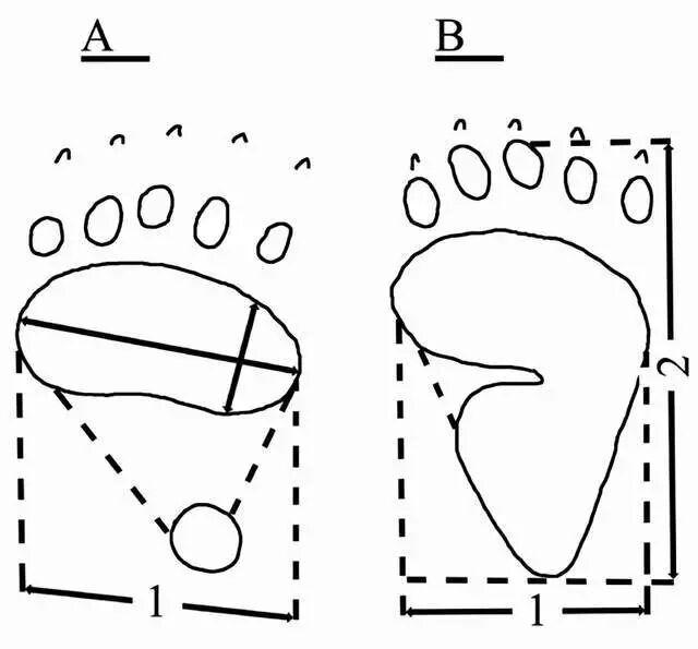 图注:A-熊前爪的脚印,B-后爪的脚印
