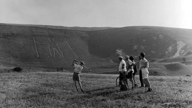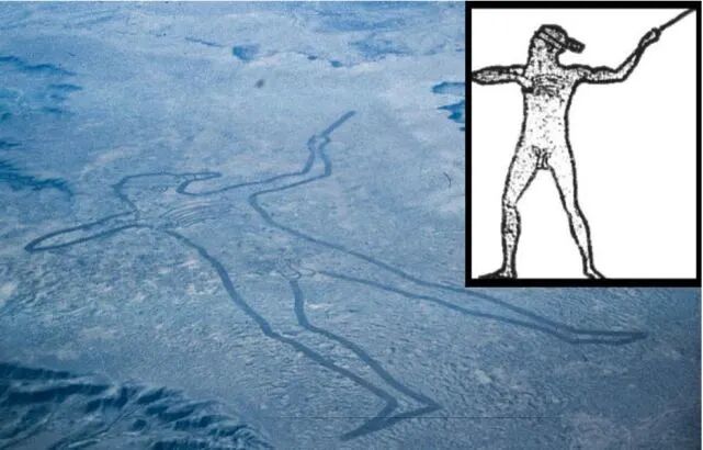 巨人像的轮廓是一个男子,手上拿着回旋镖或者棍棒。