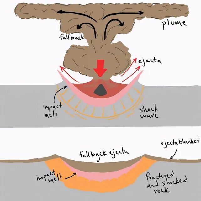 在气化陨石的同时,陨石坑周围以及底下的岩石或其它物质也会因为高温变成气体或者液体,这会永久留下痕迹,比如破碎锥、熔化的岩石和晶体等等。