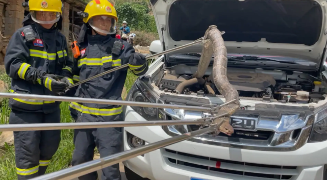 眼镜王蛇是世界上最大的毒蛇,4S店里没人敢处理这家伙,只能请来消防员帮忙将其带走。
