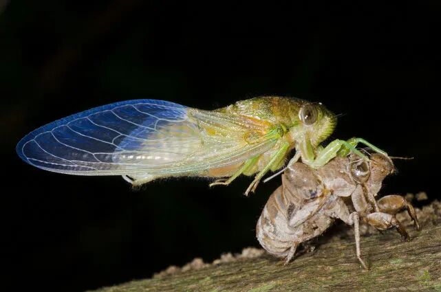 整个蜕皮过程持续一个小时,刚蜕皮的蝉和我们常见的褐色蝉不同,是绿色的,翅膀也很软。但很快,它就会成长为我们熟悉的成虫蝉。