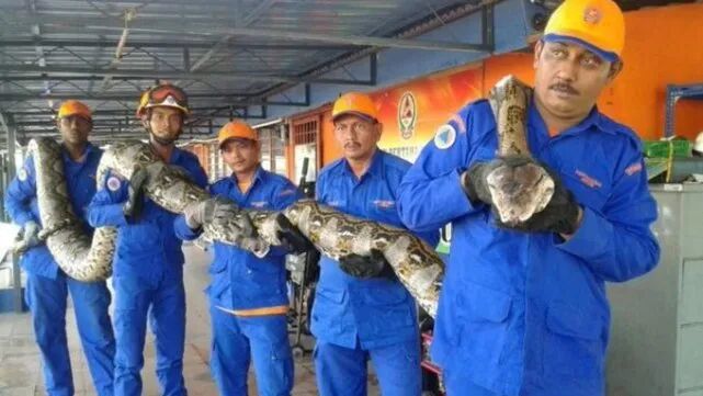 2016年也有报道称,在马来西亚的一个建筑工地里,捕获了一条8米长的网纹蟒,出动了5名壮汉,才将其抬起,不幸的是,这条巨蟒三天后就死亡了。