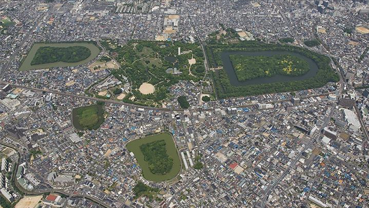 而且大部分的坟墓,构造格局极为相似,前面是方的,后面是圆的,整体看上去就像是个钥匙扣,因此还获得了个称号“前方后圆坟”,而刚才所讲的仁德天皇陵,就在这些坟墓当中,并且属于里面最大的。