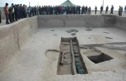 发现殉葬人两具。一具在北壁距墓底2. 35米的高处,向北另挖一小长方形竖穴。竖穴底部置一薄木棺,棺内殉葬一成年男子,仅存上半身。侧身,头向西,面朝北,嘴大张,呈反抗惨遭杀害的样子。一手执两把铜削刀。人骨架直接压于夯土下。另一具,被置于西边箱的中部,沿停壁南北放置。为一小孩,头朝北,骨架较零乱,与牛骨并排放在一起,皆染成红色,不同于一般的殉葬人。这具无辜小孩是作人牲来殉葬的,表明秦国在战国早期不仅殉人相当盛行,更残暴的人牲也还有出现。