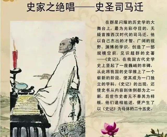 司马迁开创了纪传体裁,为后人著史提供了范例。他作《史记》态度严谨,有褒有贬,爱憎分明。