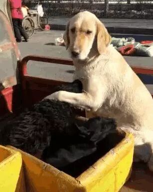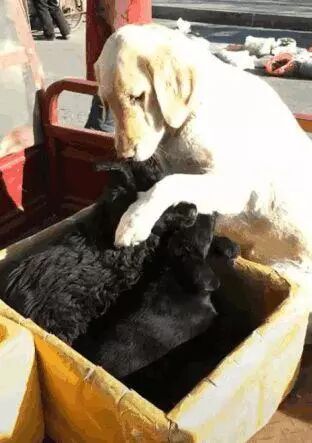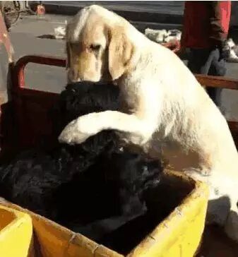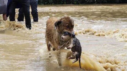 “喘急的洪水中,狗妈妈叼着自己的宝宝过河,