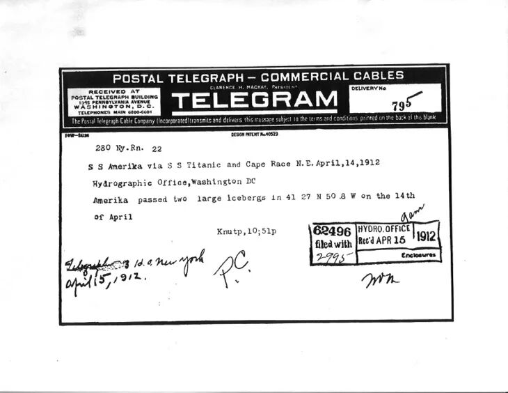 泰坦尼克号转发了关于两座大冰山位置的电报丨YvesRenard/WikiCommons