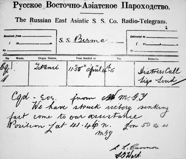 “CQD SOS 11.50pm from MGY。我们撞到了冰山,正在快速下沉,位置为 N41.46 W50.14。”
