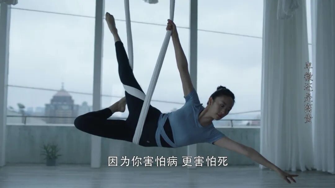 她吊在半空中,练习瑜伽的时候,你刚吃完晚饭,看了眼由于吃太过饱而微微突出的小肚子;