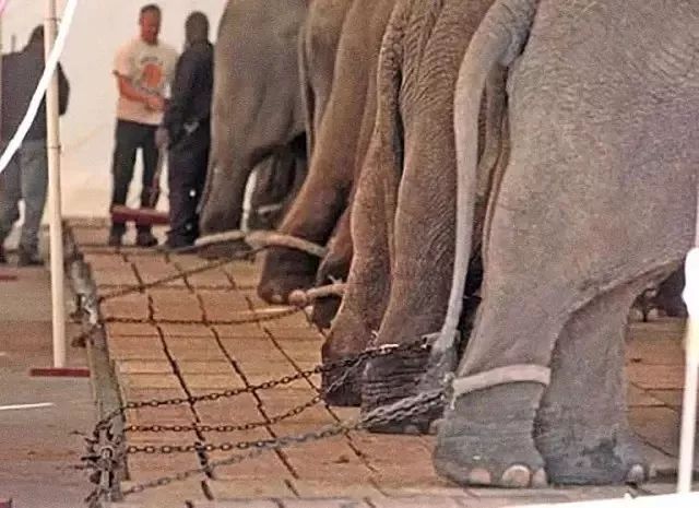 而陪伴这些大象一生的,或许只有不“工作”时脚上的铁链,和驯象师手中可怕的象钩。