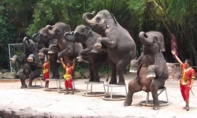 还有我们看到大象在马戏团表演的站在板凳上、投篮、踢足球......