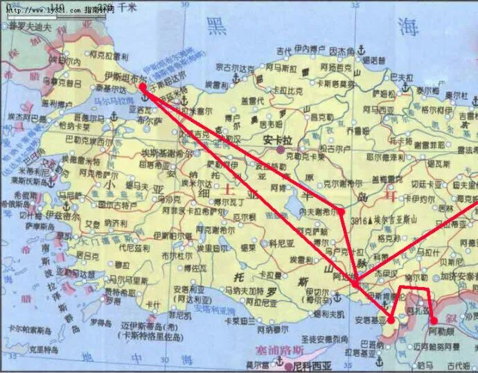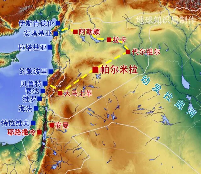 从东方来的货物在这里进入地中海世界,分别有两条路线,从幼发拉底河跨越沙漠经帕尔米拉、至大马士革、从现今黎巴嫩和以色列的港口进入地中海;或从幼发拉底河至阿勒颇,从现今的安塔基亚(安条克、哈塔伊)运出。