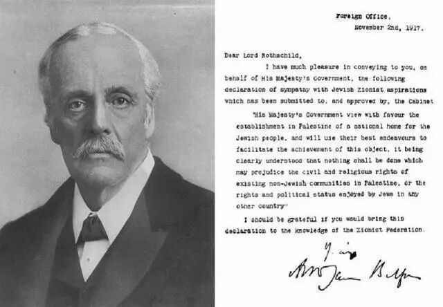 1917年11月2日,英国时任外交大臣A.J.贝尔福(Arthur Balfour)致函英国犹太复国主义者联盟副主席L.W.罗思柴尔德,公开表示英国政府支持犹太人在巴勒斯坦建立独立国家,这封信后来被称为《贝尔福宣言》。