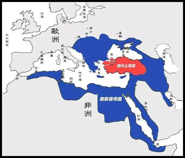 红色是现代土耳其,蓝色是近代横跨欧亚非三大洲的奥斯曼土耳其帝国。最近土耳其出兵的地区,都是其历史上曾经占有过的土地。