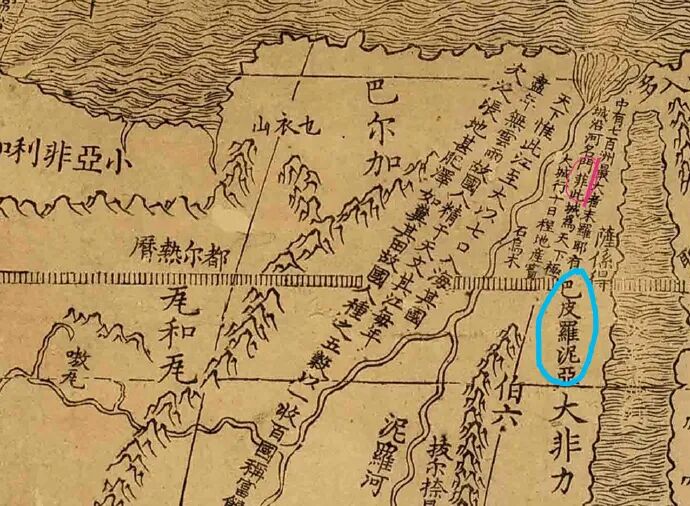埃及地区叫“巴皮罗泥亚”即巴比伦尼亚。何按:在16——17世纪的欧洲地图上记作babilonia或babylon——即巴比伦,其地在旧开罗old cairo。