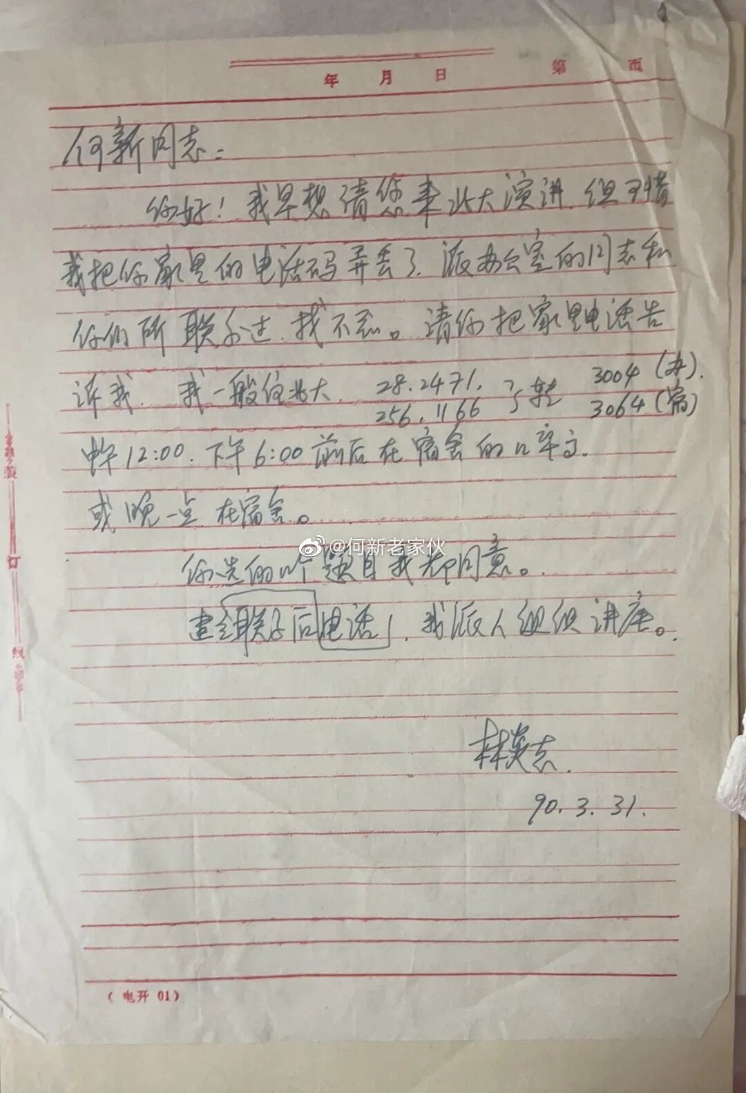 此为1990年3月北大党委书记林炎志兄的信,邀请我去北大演讲。