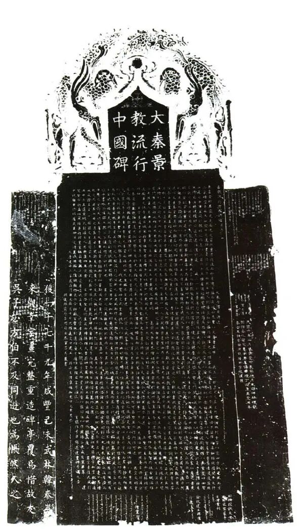 西安碑林第二室里立有一通石碑——《大秦景教流行中国碑》(国宝级文物)。唐建中二年( 781年)番僧景净撰碑文,朝官吕秀岩(有云此人即仙人吕洞宾)书文并题额。碑高 279厘米,宽99厘米。明天启三年(1623年)出土于陕西。